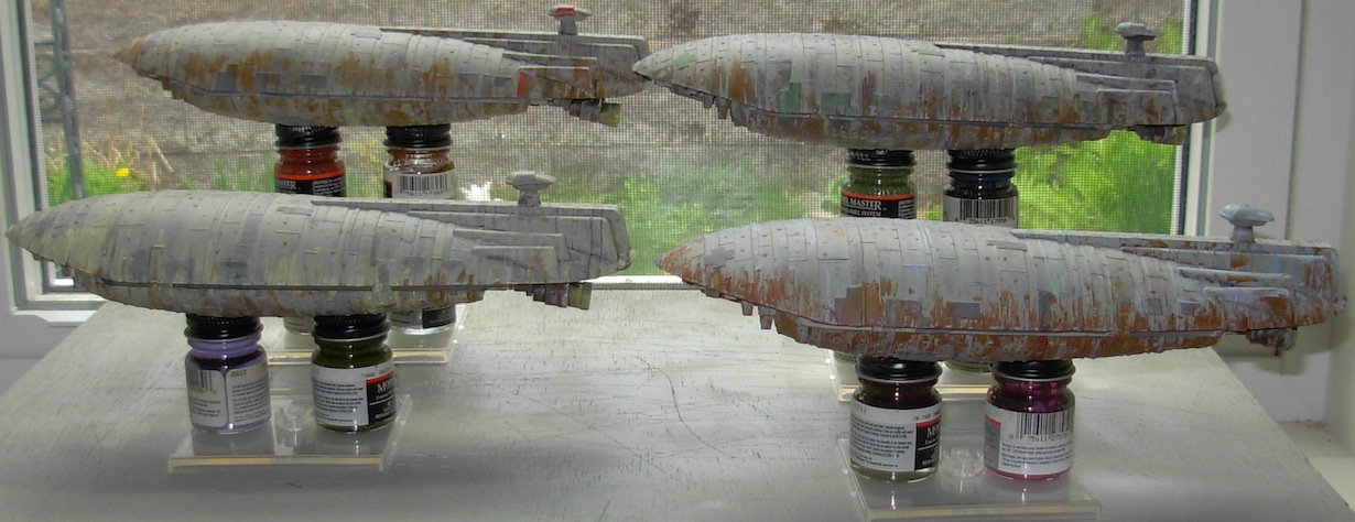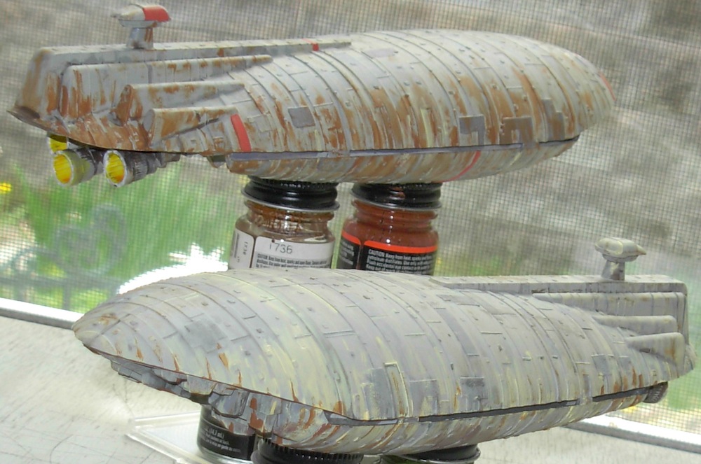 Haven’t forgotten your request for HD shots. Just got a little delayed while doing up a 5th and armed freighter (amongst many other ongoing projects…). Rummaging through the storage pile, found the 5th one, but the top dome of the conning tower was missing, so rigged up a turreted replacement and have only just now finished painting that one and also upgrading the painting on the back end of all of them. I’ll likely have photos of the whole squadron in flight in about a week or so once I’ve finished the mounting to put them on their new Litko flight stands that have just arrived.