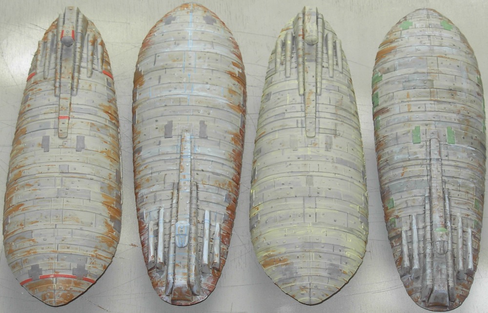 Painting was very straightforward. Primed them light grey, then added some minimal colour panels and ribbing, using a different colour on each ship. Then went to town with heavy weathering using a variety of colours dry-brushed on. Used slightly different combinations of weathering colours on each one for a subtle unique differentiation — they all haven’t been making identical shipping runs and have been exposed to different elements at different destinations. Finished off the top surfaces with some lighter highlight dry-brushing. When that was all dry, sprayed them with Dullcote for a flat finish. Then after the Dullcote was dry, painted the engine glow and dry-brushed the light yellow light spill from the engines. Engine glow is Clear Turn Signal Amber, applied very thickly and allowed to pool heavily in the recesses of the thruster rings.