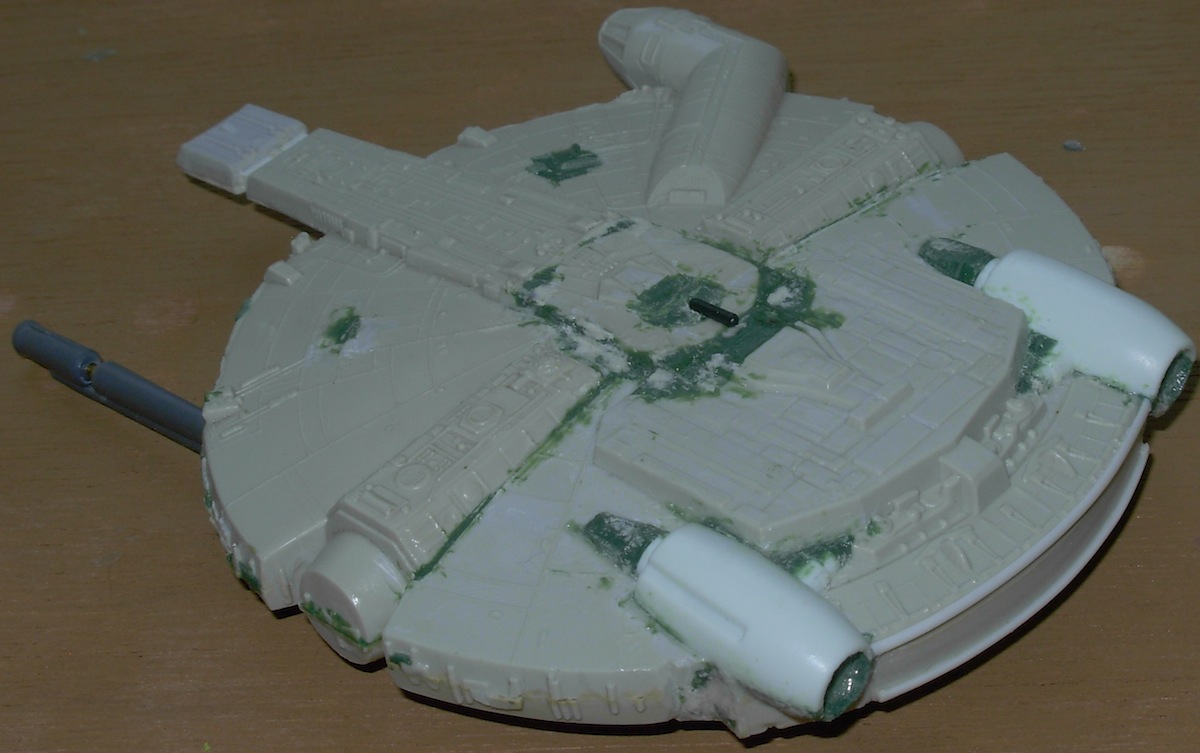 Then much modelling ensued. Fun was had with carving, green putty, and contour putty. Engine nacelles, long sensor boom, and a few minor greeblies provided from the bits box. Central engine rims added with .040″ half-raound strip. The distinctive shape of the boom was made by cutting apart a long antenna piece and drilling and gluing in a bit of brass tube. More strips of plastic were glued inside the front hull extension to extend it even longer and provide an attachment point for the additional piece taken from the bottom, then an additional piece cut from .030″ sheet was fitted across the whole extension to thicken it up a bit.
