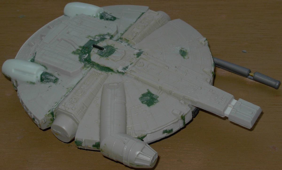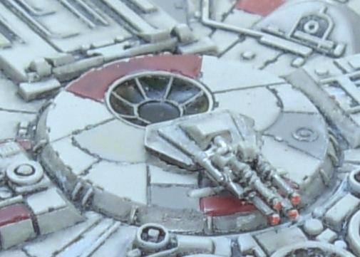 First up, a little bit of easy re-working on the FFG Millenium Falcon. Just recently poked at the upper gun turret, and discovered that it is easy to remove. In its factory mounted position facing forward, it obscures the view port underneath it. Sliding an XActo blade under the edges of the turret, it pops out fairly easily. To mount it facing to the rear of the ship, simply extend the holes the turret’s pegs go into by carving with the aforementioned XActo blade. Extend the holes towards the front of the ship until the turret fits into postion to match that of the rear-facing turret on the bottom of the model. Put the turret back in with a drop of glue to secure it, and admire the lovely upper view port.