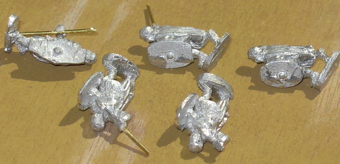 When spears cast onto figures are too bendy for my tastes and likely to turn into spaghetti during play, I replace them with brass spears. For 15mm figures, 1/32″ brass wire works nicely for spears, and .020″ brass wire for javelins.
