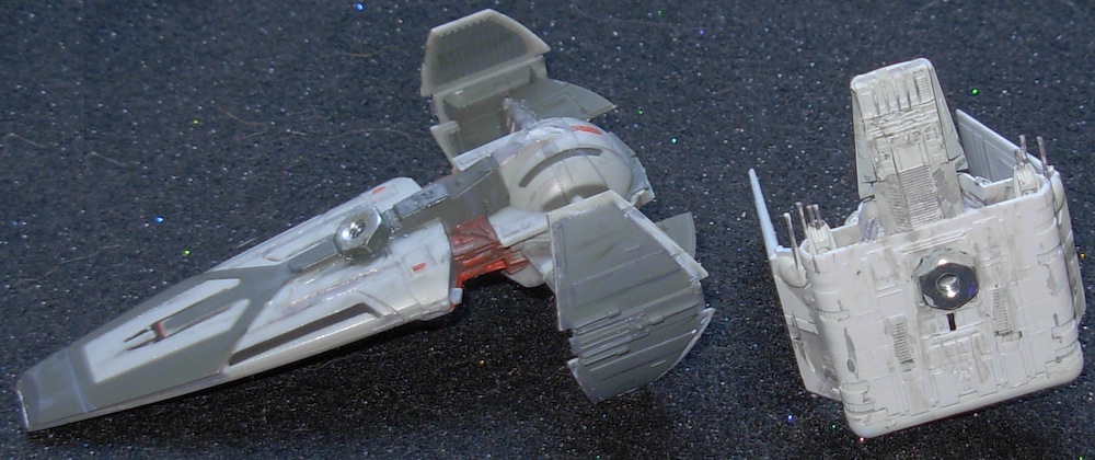 The Sheathipede took a bit more work to mount.  The figure comes with a threaded post, but the threading is metric and also much smaller than #6-32. The quickest solution I came up with was to use a 3″ length of #4-40 threaded rod.  It doesn’t quite match the threading in the shuttle, but I was able to jam it in and force twist it into place.  It is also too skinny to quite fit into the nut in the base, so I used the plastic sleeve of the ship’s original mounting and epoxy to permanently attach it.