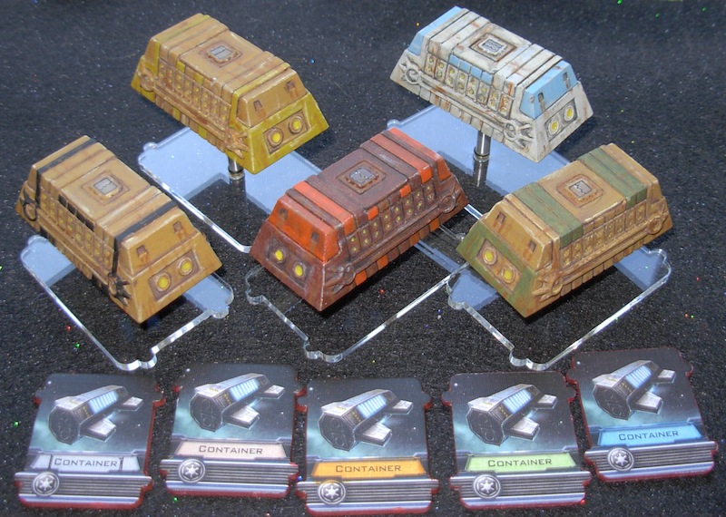 Here’s all 5 containers.  I also used magic markers to colour code the container counters that come with the Millenium Falcon.  Each counter can be used as a ship card to track damage and any other status markers for each container.