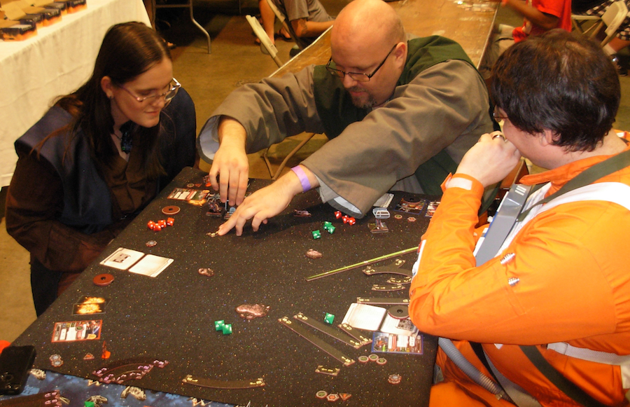 Some of the folks from Alderaan Base, the local Rebel Legion outpost, got a break from their staffing shifts to come over and try out the X-Wing demo games I was running for Pandemonium Books & Games at the con. Don’t tell anyone, but that X-Wing pilot is flying Darth Vader’s TIE Advanced in the game ^,^