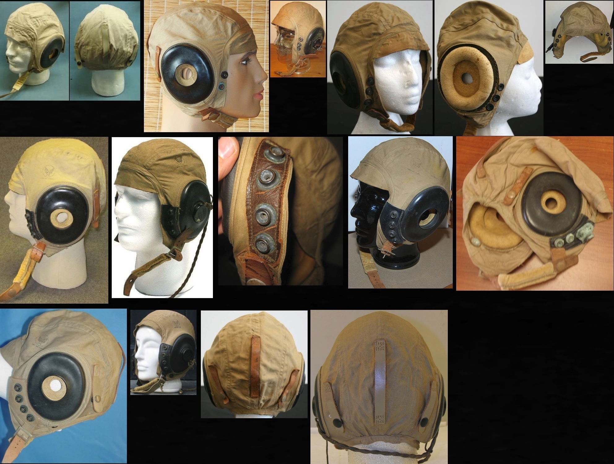 Bottom Row: An A-9, ANH-15 [light pink!], and Leather flight helmets. The last helmet shows a more straight-edged style of leather snap backing compared to the more angular styles up above it.