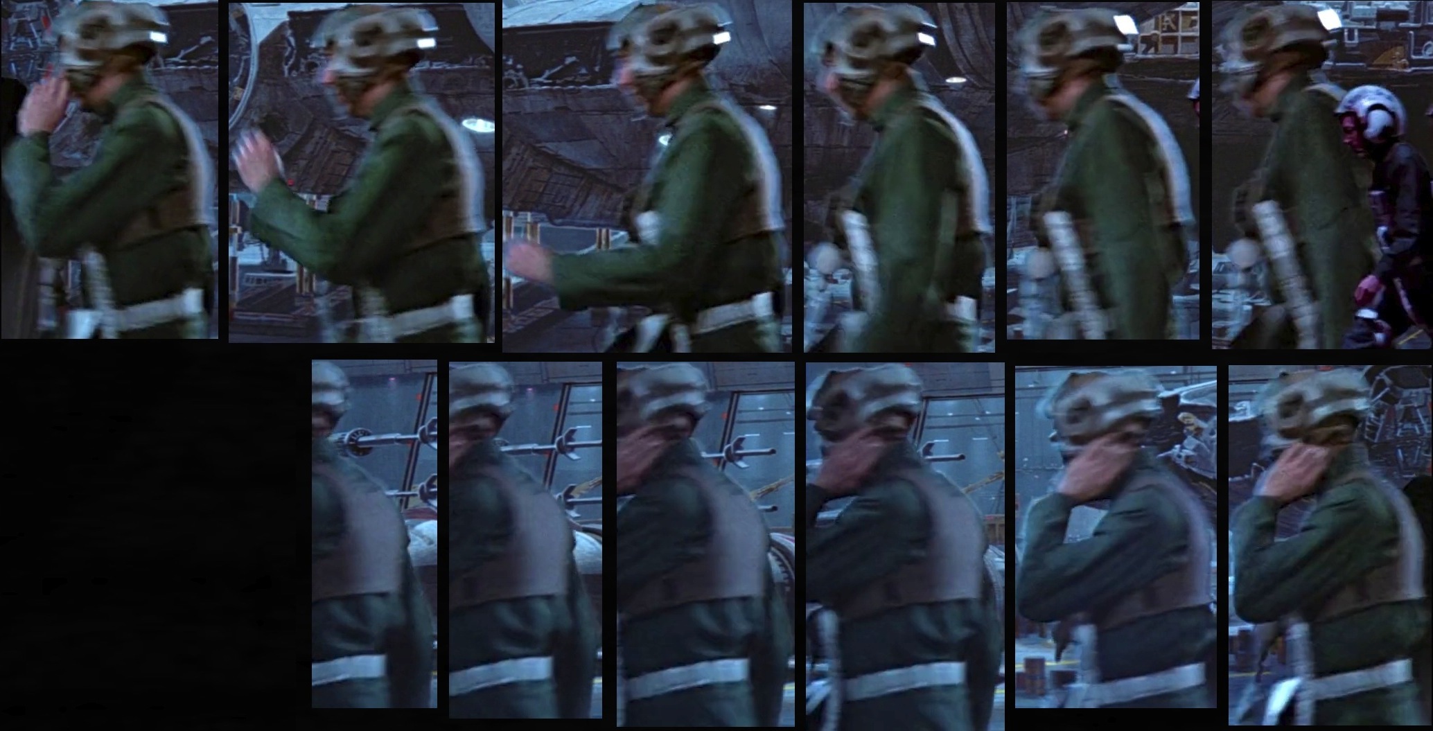 Very shortly after beginning work on my own A-Wing costume, I had to pause to do some heavy video research to help figure out some of the details before I could really proceed. A friend who is much more tech-savvy than I am helped me take the screen captures of all the A-Wing pilots scurrying through the Hangar Scene in Return Of The Jedi. I put these together into montages. There are variations in some of the costuming details among the various pilots.