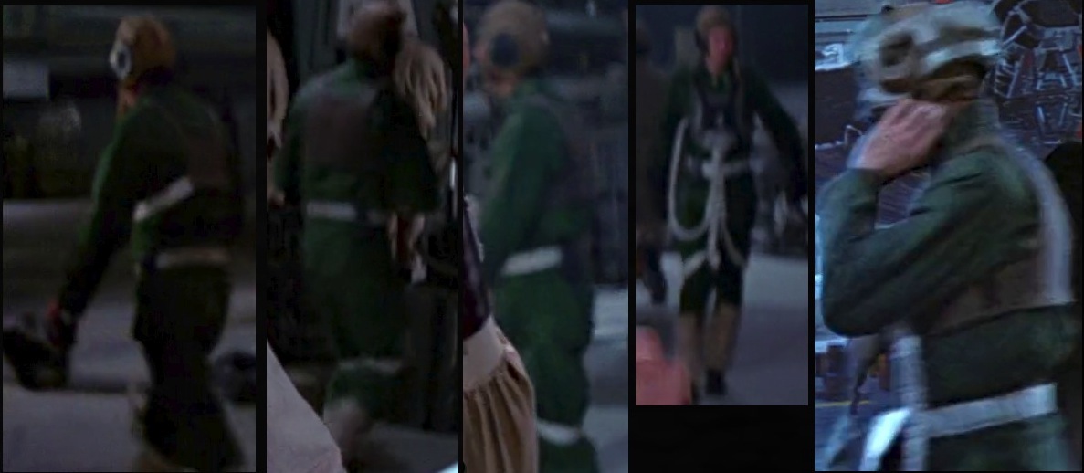 Studying the screencaps for various costume details is tricky as none of these pilots are in crisp camera focus. Attempting to read many of the details is quite subject to interpretation. Here is my first interpretation of a number of bits: