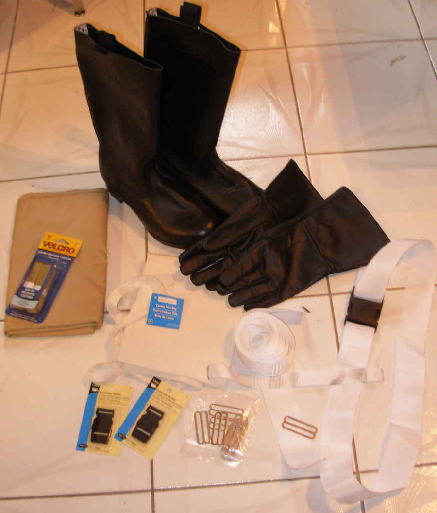 Bottomweight twill for the gaiters, canvas totebag from the dollar store for the flak vest bib, assorted hardware, and 2″ white nylon webbing for the belt and ejection harness.