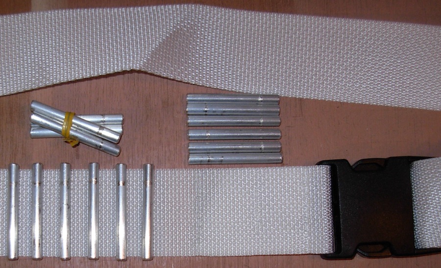 The 1″ wide webbing is for the loops to hold the flares on the belt. I’ve done a little pre-weathering test on this. When working with nylon webbing, I like to heat-seal the ends by passing it quickly through a candle flame (while wearing a respirator). Done lightly and quickly, this does not soot up the nylon. But Star Wars kit should look properly weathered! So I passed this bit of webbing through the candle to pick up some light sooting. I’m happy with this test, and when I’ve finished adding the flare loops onto the belt, I’ll give the whole thing a bit of this weathering treatment, and the leg harness too.