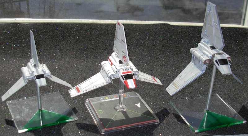 Here’s a comparison photo of the 3 different shuttles with close enough scales to use in X-Wing.