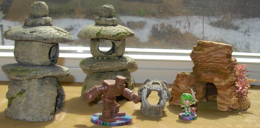 Every time I go into a pet store to get supplies for the household herd, I always go through the aquarium decorations aisle and see what’s in the clearance section. And the toy aisle in dollar stores is always worth a peek.