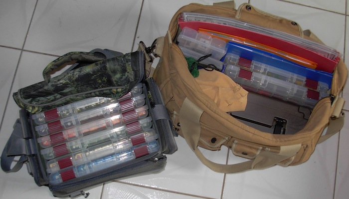 And if I’m travelling for some serious Dragon Dicing, then I can also carry a Plano shoulder bag which can hold up 6 of the 3601 boxes. 12 pound load of dice in the Plano bag: