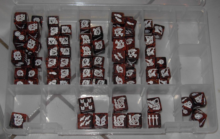 The addition of more tokens coincided with a general push to standardise my dice storage and transport systems. Up til now, I’ve kept my ready-armies in the old TSR dice pouches, and additional dice in larger pouches. Alas, the collection has grown too big for this system and it was time to break down for the more functional Plano option.