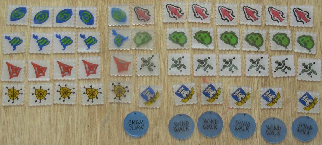 Here’s the new batch of tokens. The ones in the middle column are frosted side up to show the difference, and one of the Wind Walking spells sparkle side up: