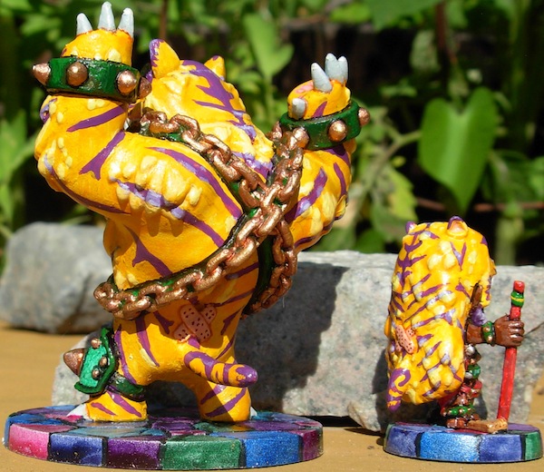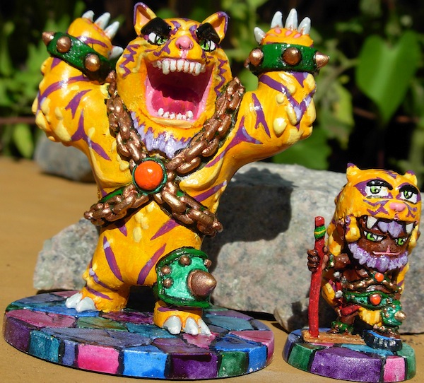 Also, since I’m somewhat partial to cats, I did a bit of a makeover for the Druid and Angry Bear combo — creating the Druid and Mad Big Cat. (Painting is currently still in progress for another pair — Druid and Big Mad Wolf.) Some slight recarving on the snouts and ears. Tails added with a bit of heated and gently stretched plastic sprue.