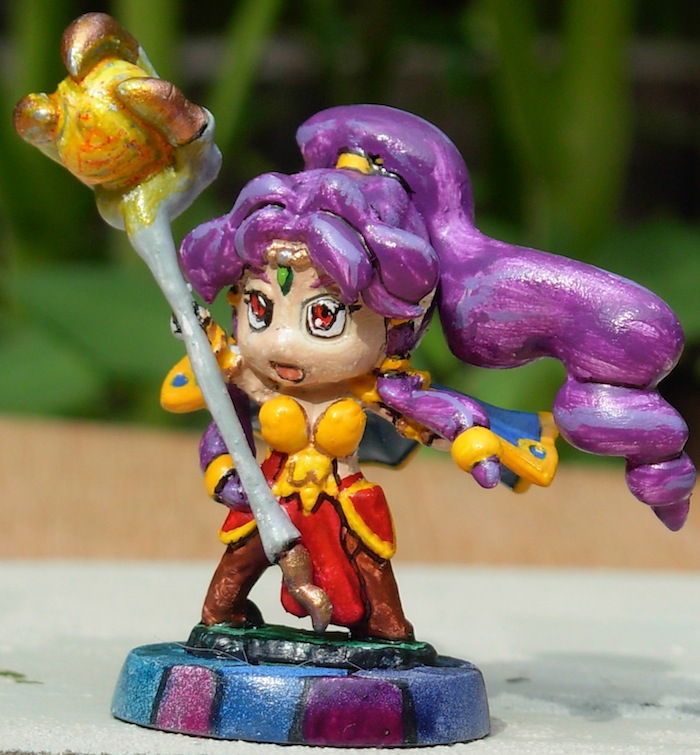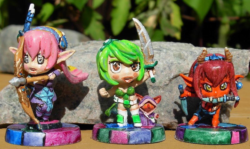 Before painting any of the Heroes though, I had to do a group of conversions first. A chibi game requires a neko-chan figure which SDE was lacking (the Nyan-Nyan character would come several years in the future). A dungeon-adventuring party in a board-game version of a computer-game naturally led to thoughts of Dragon Pink! And so the Pink party was converted to match the OVA characters. Those [really entertaining and hilariously educational] midnight hours spent at Dick & Busters’ Hentai Dubbing events in the grand ballroom at Anime Boston have had some practical results!