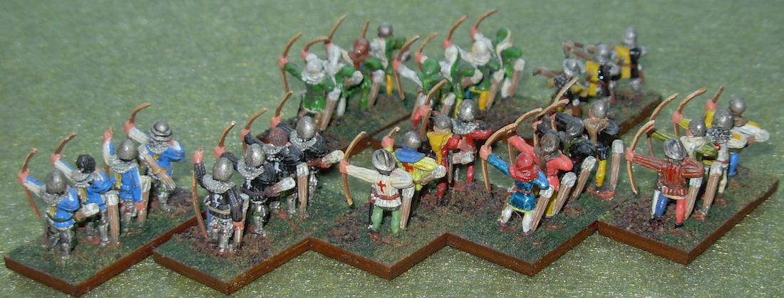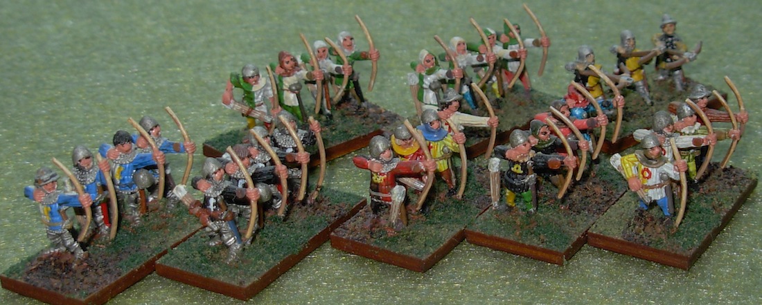 Livery was in some use during this period. I opted to apply it with medium vigour, since I like painting heraldry. The archers attending the general’s stand got the heaviest dose. Other nobles only got 2 liveried figures each, arrayed with other archers bearing the red cross of St. George. In the front row, from left to right the archers of: Guant (4), Woodstock (4), Stafford (2), Ufford (2), and Despenser (2). In the rear row from left to right: 2 stands of archers in green and white from Cheshire, Flint, and/or Wales; de Buch’s crossbowmen (3).