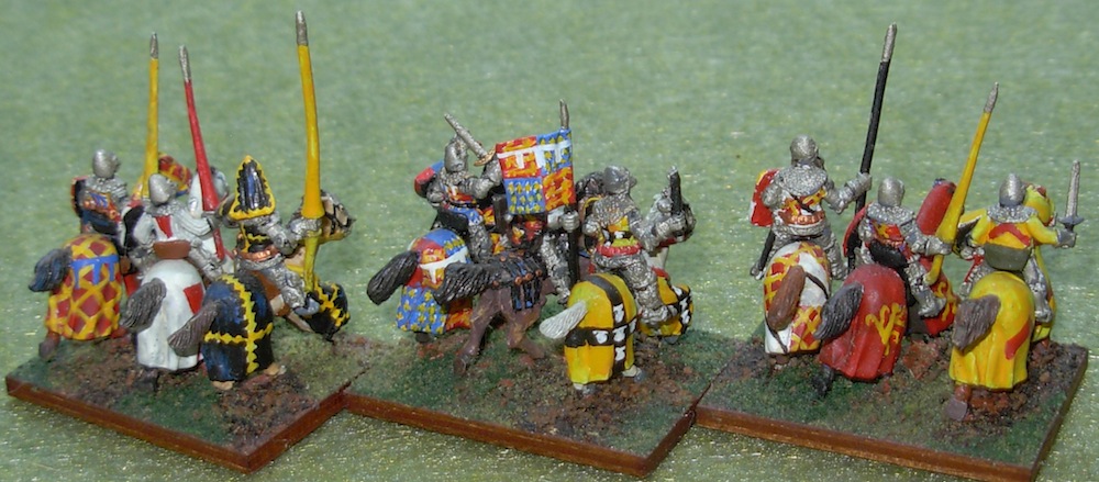 In the center: the General = The Black Prince and/or John of Gaunt, the Captal de Buch, and Sir Wm. Thatcher (aka Ulrich von Lichtenstein) as standard bearer. Yes, I did handpaint the Plantagenet coat of arms 18 times for this army!