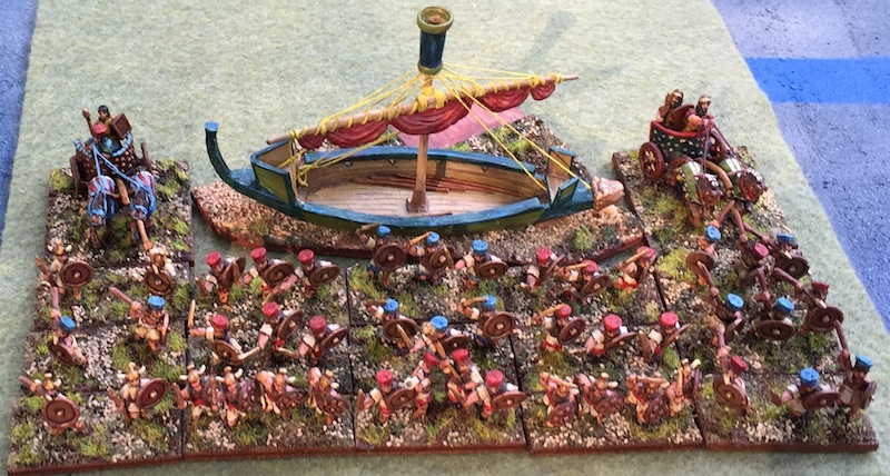 Army List (2nd edition) I/28 Sea Peoples 1208–1176BCE: 1xLCh or 4Bd Gen, 2x4Bd, 6x3Bd, 3x3Ax or 2Ps. I/29 Philistine 1166–600BCE (a) 1166–1100BCE: 1xLCh Gen, 1xLCh, 6x3Bd, 2x3Ax, 2x2Ps. (b) 1099–600BCE: 1xLCh Gen, 1xLCh, 6x4Sp, 2x3Ax, 2x2Ps. Background Sea Peoples — Aarrr! Driven to sea by the Hittites, they landed on the shores of the Levant and fought to establish a land of their own. They fought many battles with the 19th Dynasty Egyptians, were eventually defeated by Ramses III, and resettled into Canaan. This was possibly the roots of the Philistines. There are linguistic hints about the origins of both peoples, but the full and precise details are lost in the mist of time and tide. Figures 15mm figures, mostly Old Glory. The boat is Essex, as are the Spear figures for the later Philistine army (not shown here yet, they are currently winging their way across the Atlantic and will be painted after arrival). The original painting on the Old Glory figures was done by Paul Potter, commissioned by one of our local club members who was then selling excess armies, and I bought this one. Paul uses a black undercoat and a very fast and wet painting technique with very quick and very decent results. I did some touch up on these to brighten the paint and crisp the lines. This army had also originally been mounted on metal stands, and I cut the figures off those and mounted them on my preferred Litko bases. Some of Paul’s flocking was carried over during this process, then I added my own flock and ballast mix to finish up the stands. The Chariots, as well as touching up the paint I added reins with strands of thread and drilled out the drivers’ hands to hold them. A lot of fiddly work with tweezers getting the reins all in place: