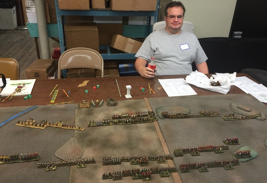 Last weekend was the annual local Games Day hosted by the FLGS — The Hobby Bunker, and our miniatures club — Boston Trained Bands. As part of the festivities, I hosted a giant Big Battle DBA game in the morning session. This was a fun game and visually epic with 61 stands of figures on each side, we’ll play this again sometime on one of our regular monthly DBA days. Here’s the promo blurb from the events listing:
