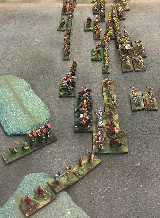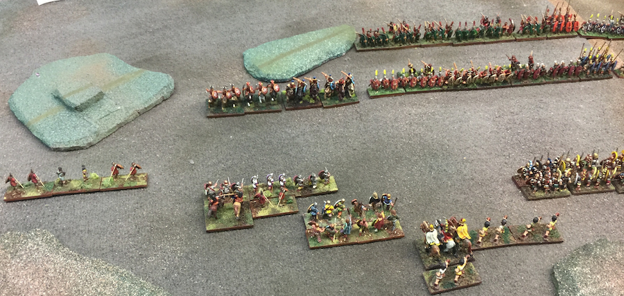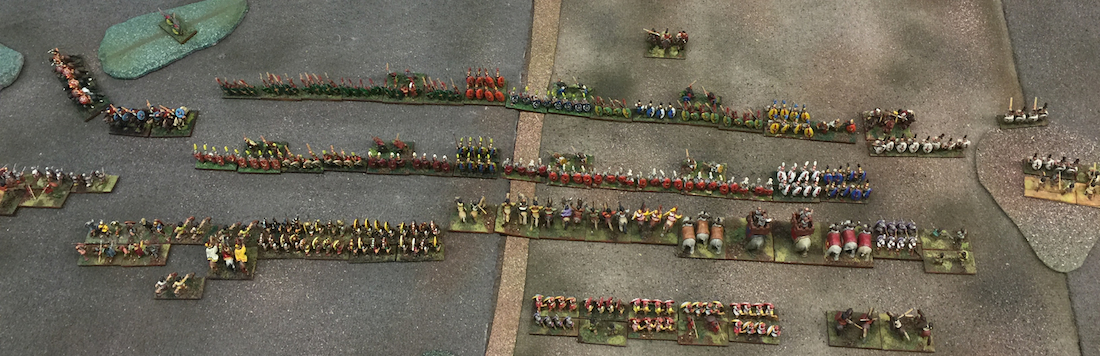 Played with DBA 2.2+, and following special scenario rules to accommodate potentially up to 5 players per side. These rules were to insure that no player would have a low-pip low-troop army as per the standard BBDBA rules. And the Commanders’ extra pip modifiers would keep the game flowing.