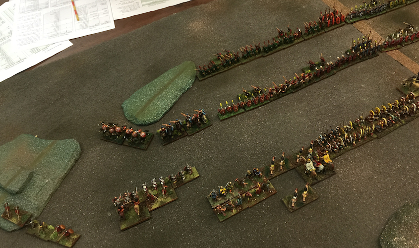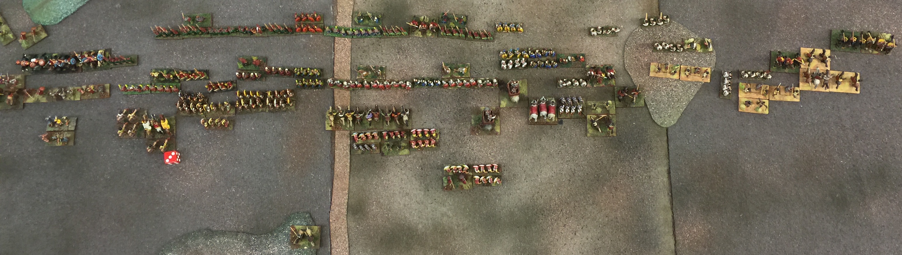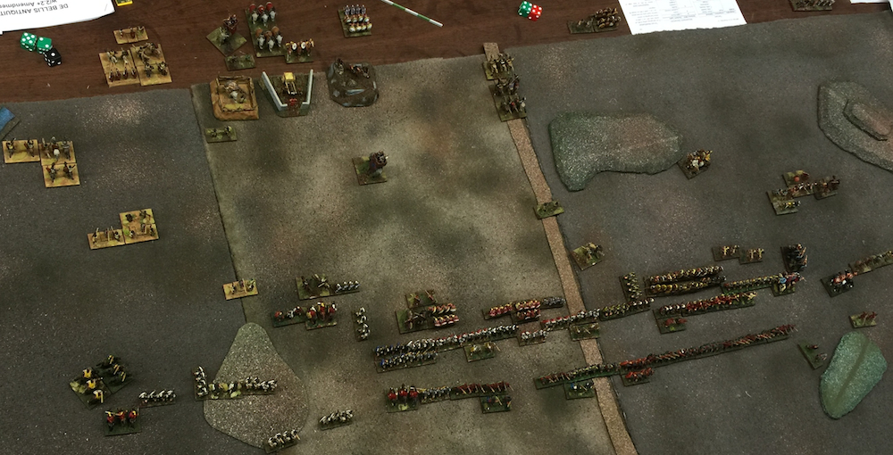 Initial deployment, the Roman army (right) advancing down the road towards Carthage, the Bagradas River in the foreground, hills of the river valley at the far side of the table. The Romans deployed 3 commands in the front with Regulus in the center, 2 in reserve. The Carthagians deployed 4 in front, Numidians in the foreground, then the Carthagian Elephants, then Greek mercenaries, and Carthagian light troops in the hills, Xanthippos in center reserve.