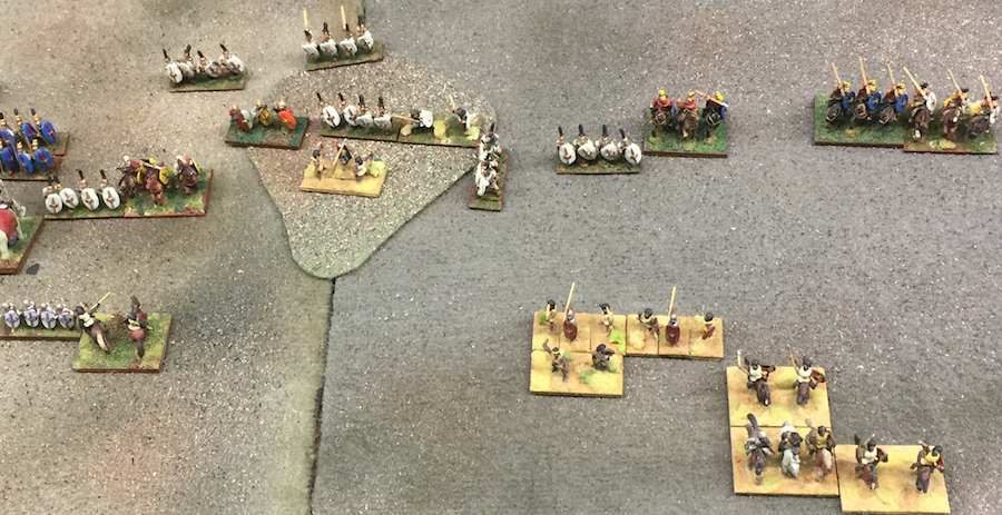 Top of the 4th turn, the Romans advance steadily on their right and center. Their battleline hopes to come to grips in the center before their endangered flanks might be rolled back. And on their left, bolstered with a bonus pip from Regulus, the flank commander can engage with their infantry moving through the rough ground first against the Numidians before their own flank is hard-crunched by overwhelming numbers of Light Horse. Alas for the Romans, when the dice have rolled this combat will yield no Carthaginian casualties.